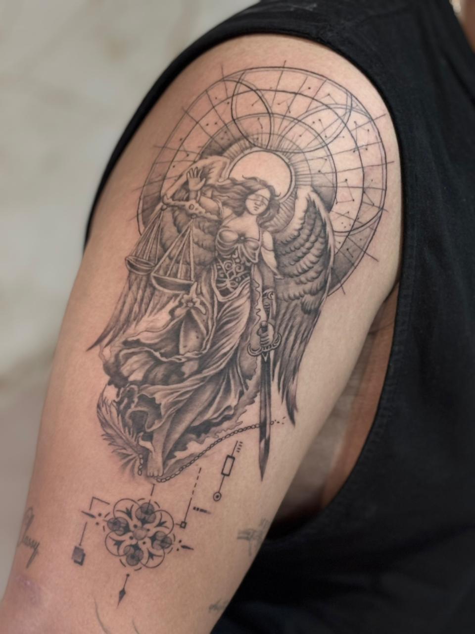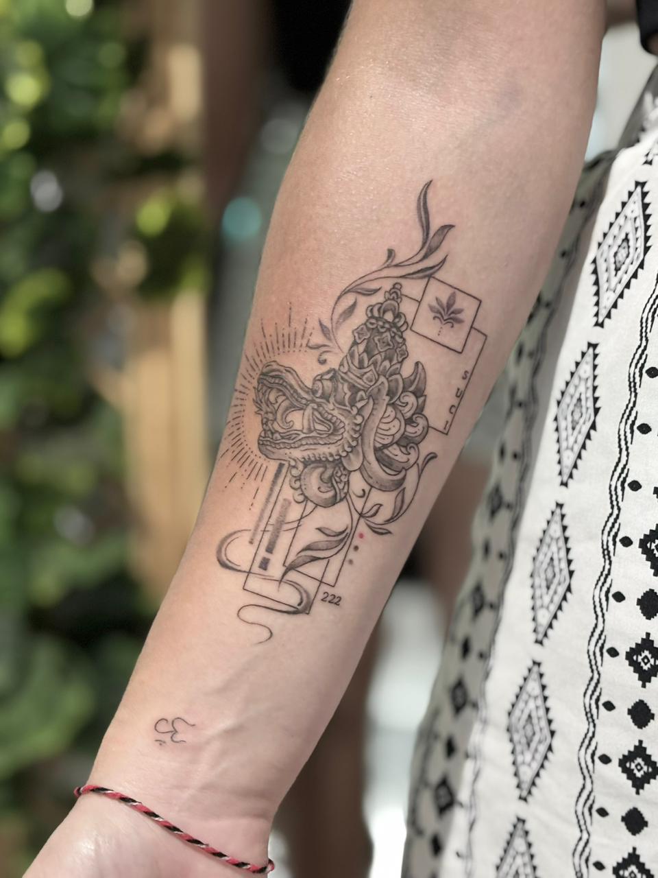 Mixed with Geometric Lines. A blend of realistic details and clean geometric elements, combining depth, structure, and modern fineline aesthetics.